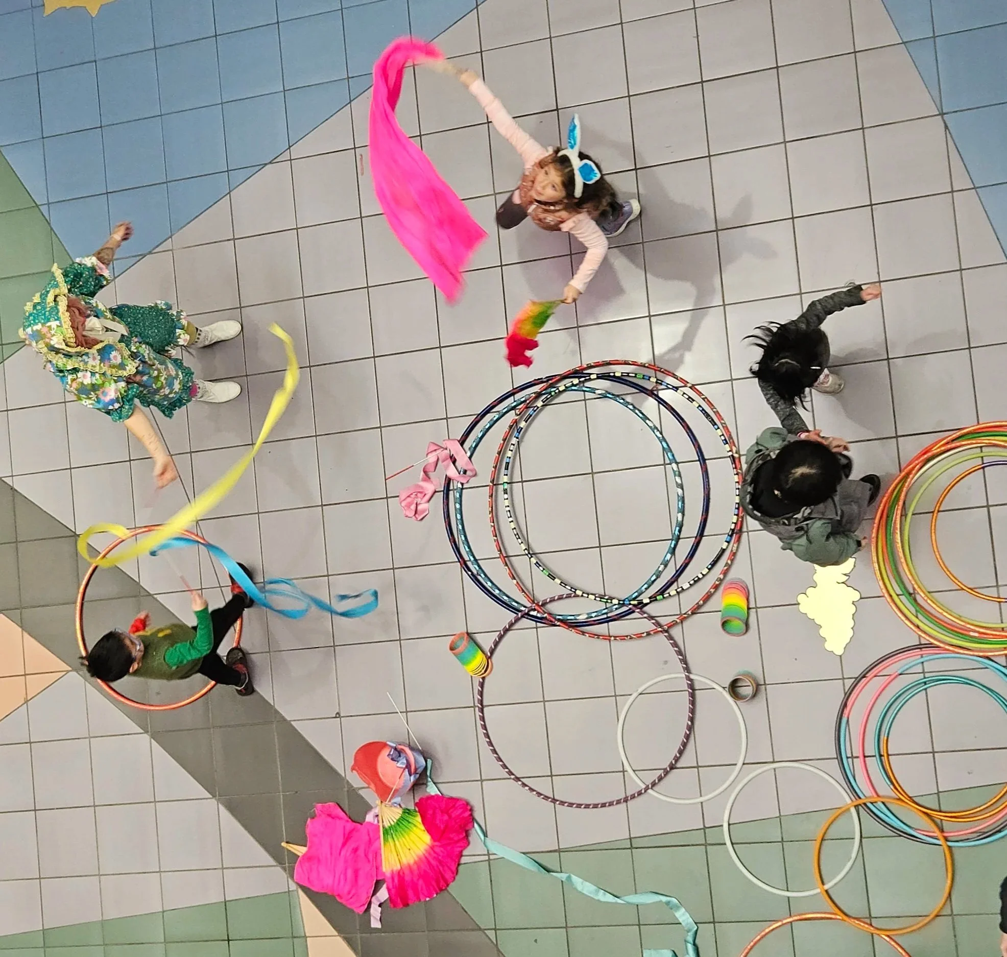 Hula hoops, Juggling Props (balls, clubs, scarves), Dance Ribbons, Dance Fans, Dragon & Sock Poi, Diabolo, Flower Sticks, Jump Ropes, Frisbees, Sidewalk Chalk, Bubble Wands, Sensory Toys, and more!