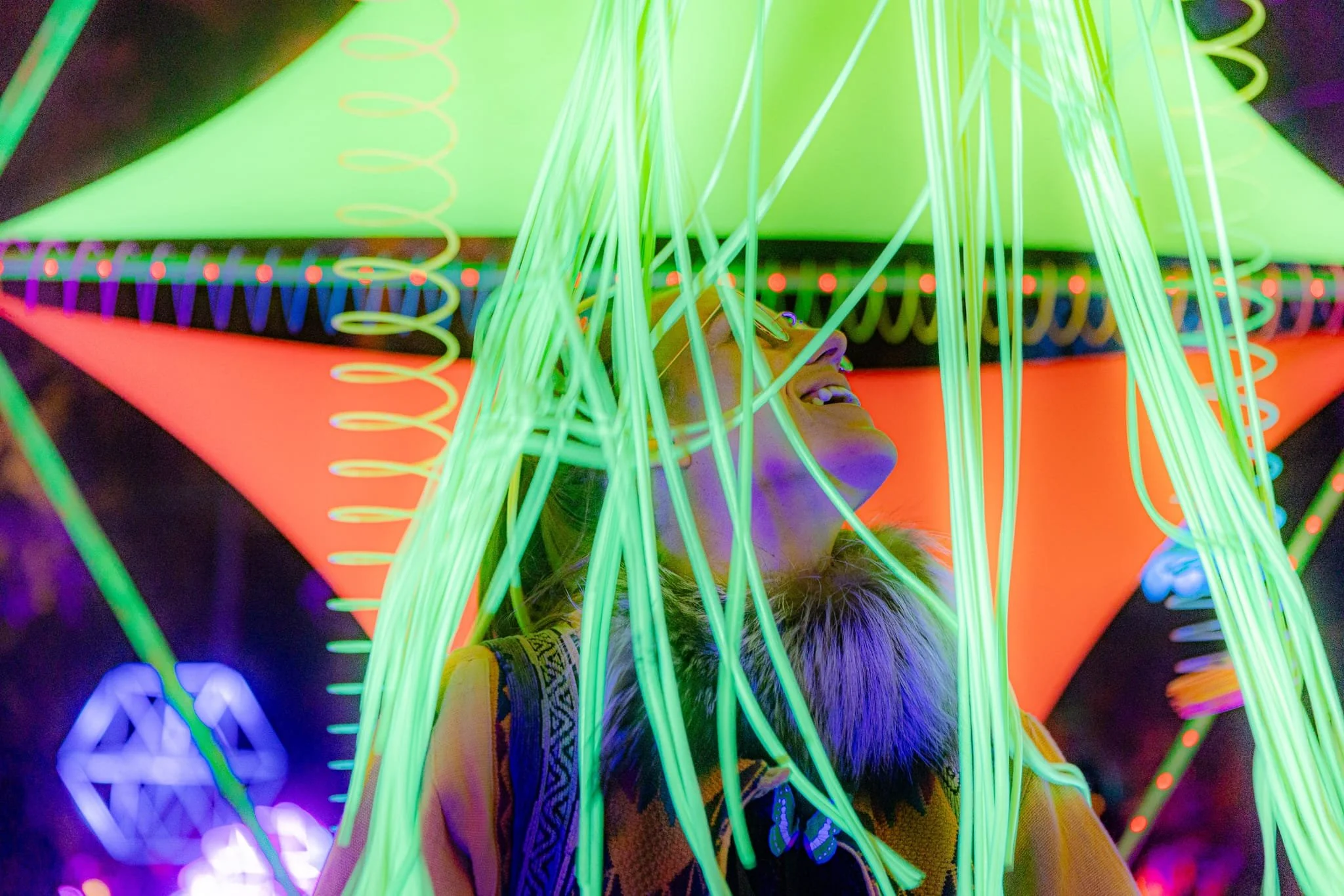 Slinklandia is a meeting place where fun and connection weave effortlessly into the bright and welcoming environment. Adorned with dozens of UV reactive slinkies, fabric, hand-made tassels, and LEDs, Slinklandia invites participants to reconnect with their inner child through play and evokes a sense of nostalgia for the colourful memories of our childhoods past.